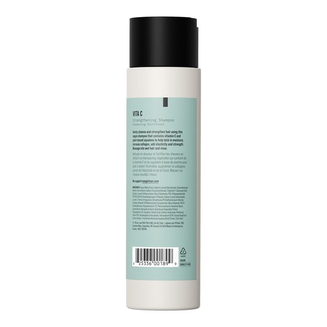 Vita C’s sulfate-free formula gently cleanses, nourishes and restores dry or damaged hair. Vitamin C and plant-based squalane help increase collagen and add elasticity, while vegetable protein strengthens the cuticle. pH 5.5-6.5. Gently cleanse and strengthen hair using this vegan shampoo that contains vitamin C and plant-based squalane to help lock in moisture, increase collagen, add elasticity and strength.
